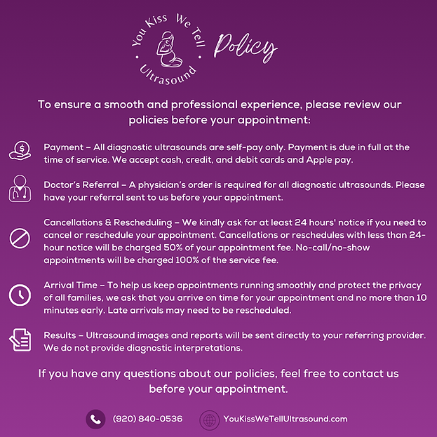 At You Kiss We Tell Ultrasound, we specialize in a wide range of diagnostic imaging services including OB/GYN, Abdomen, Superficial Parts, and Vascular Ultrasounds, IVF & fertility monitoring, and elective screening & preventative ultrasounds. Whether you're monitoring your pregnancy or fertility, or checking on your health, our highly qualified sonographers provide accurate imaging and the reassurance you need. We provide diagnostic ultrasound services for low self-pay rates, making it easier for both insured and uninsured patients to receive the benefits of ultrasound care without financial strain or insurance barriers. Located in the heart of the Fox Valley, we make essential ultrasound care accessible, affordable, and stress-free for individuals and health care providers.